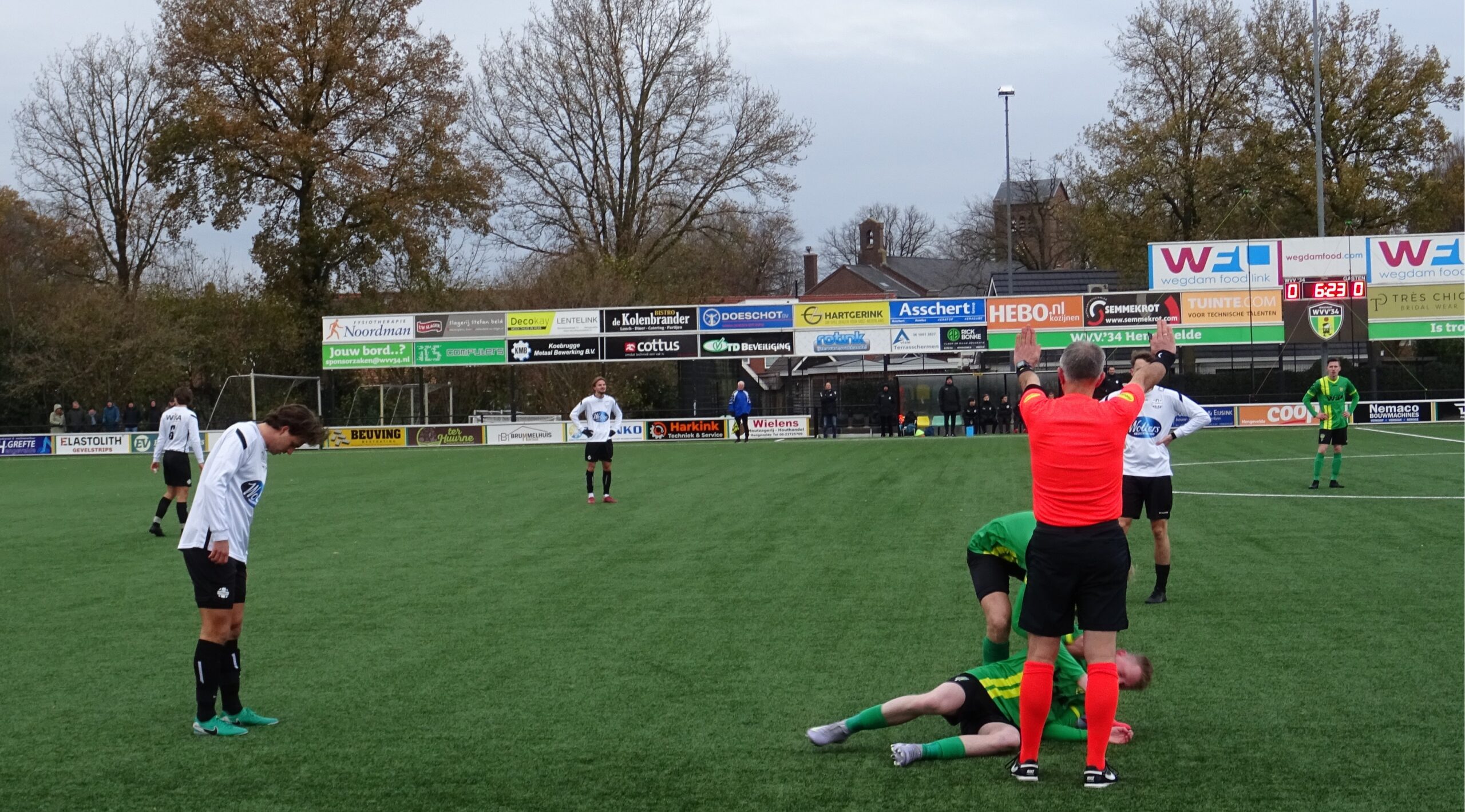 WVV’34, dat goed aan de wedstrijd begon, kreeg te maken met twee vroege blessures. Toch kwamen de gastheren in de 19e minuut op voorsprong via een strafschop. Yoes Beldman probeerde zijn tegenstander nog te stoppen, maar de voorzet kwam er toch uit. Lars Aarnink ging vervolgens gewillig naar de grond en Tom Grobben benutte het buitenkansje: 1-0.