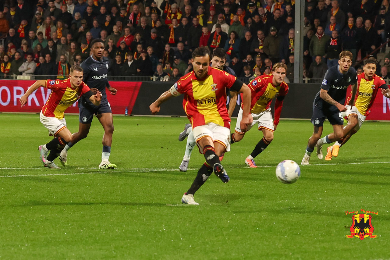 Na een klein kwartier viel de openingstreffer. Suray nam een vrije trap slim op de borst aan, gleed echter weg, maar Deijl pikte de bal op. Achtervolgd door Sauer, die hem vasthield binnen de zestien, kreeg hij een strafschop. De aanvoerder schoot die zelf onberispelijk binnen: 1-0. Dat gaf de thuisploeg vertrouwen. Tactisch stond het goed, maar met de energie van de voorsprong werd het ook strijdbaarder. Feyenoord kon geen kansen creëren; telkens liep het stuk op de onverzettelijkheid van de rood-gele formatie. Kramer zag zelfs zijn volley van de lijn gekeerd door Watanabe.